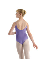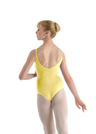 Capucine is a classic camisole leotard with ruched front accent and wide mid-low V-back, perfect for class or dress code and for dancers of all ages.