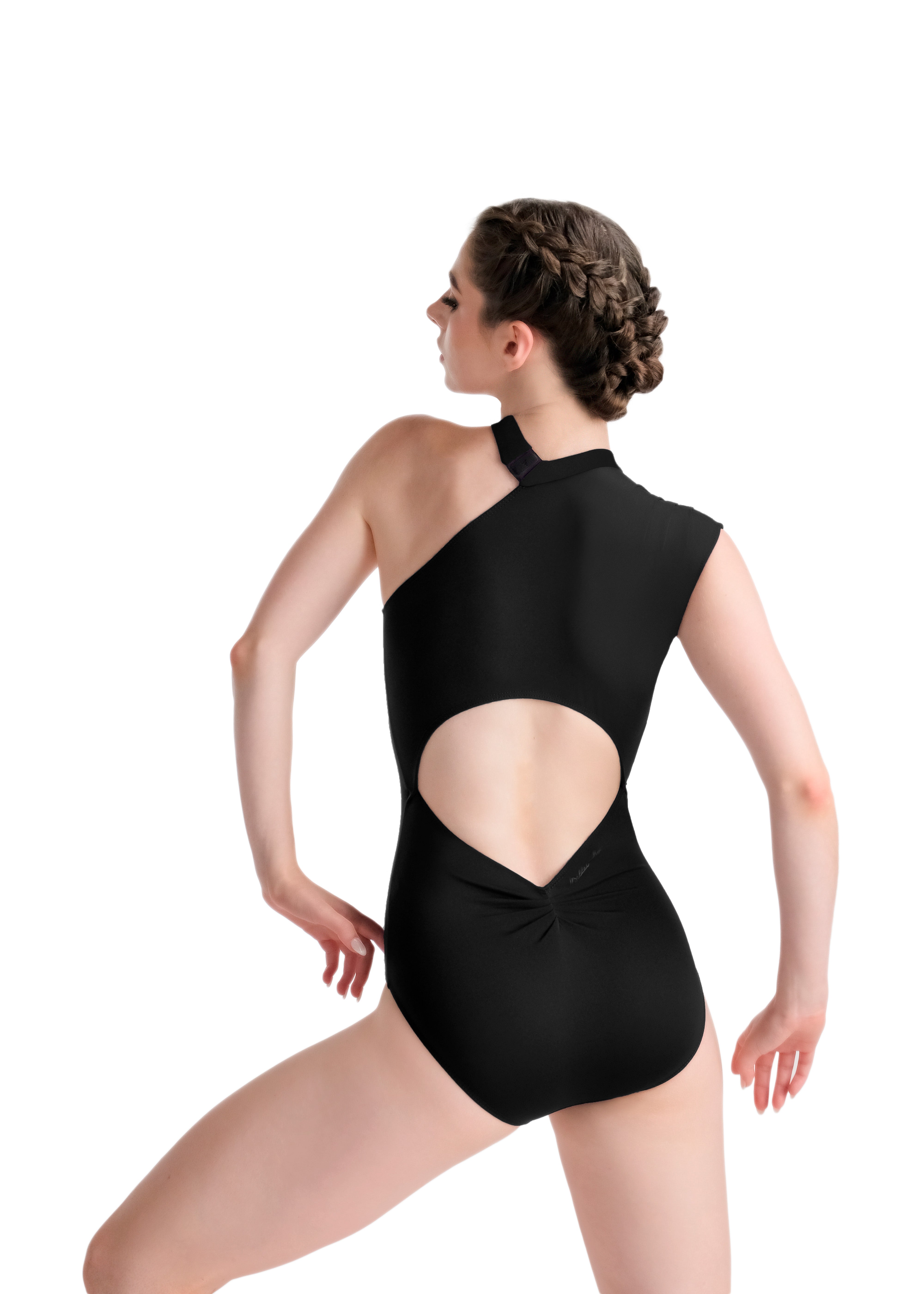 Over the shoulder, fabric gathers to create a chic effect, unique for a leotard style.