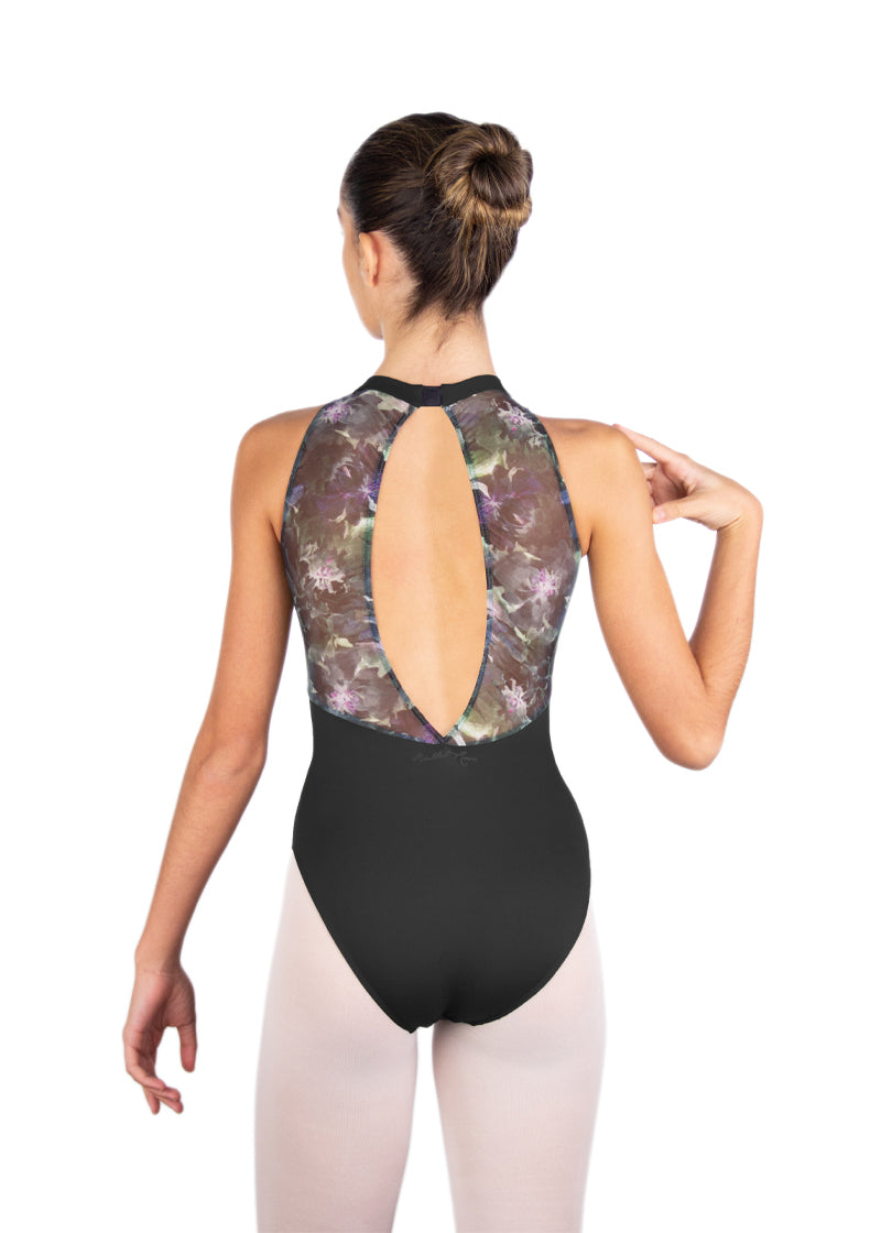 High Neck Princess Seam Floral Print Mesh Back Leotard