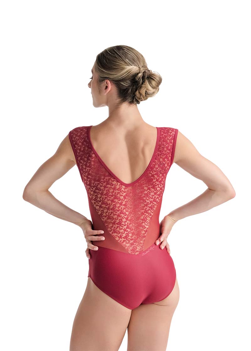 Along the sides, angled stretch mesh cutouts cinch the waist and create a flattering contour, enhancing the dancer's silhouette.