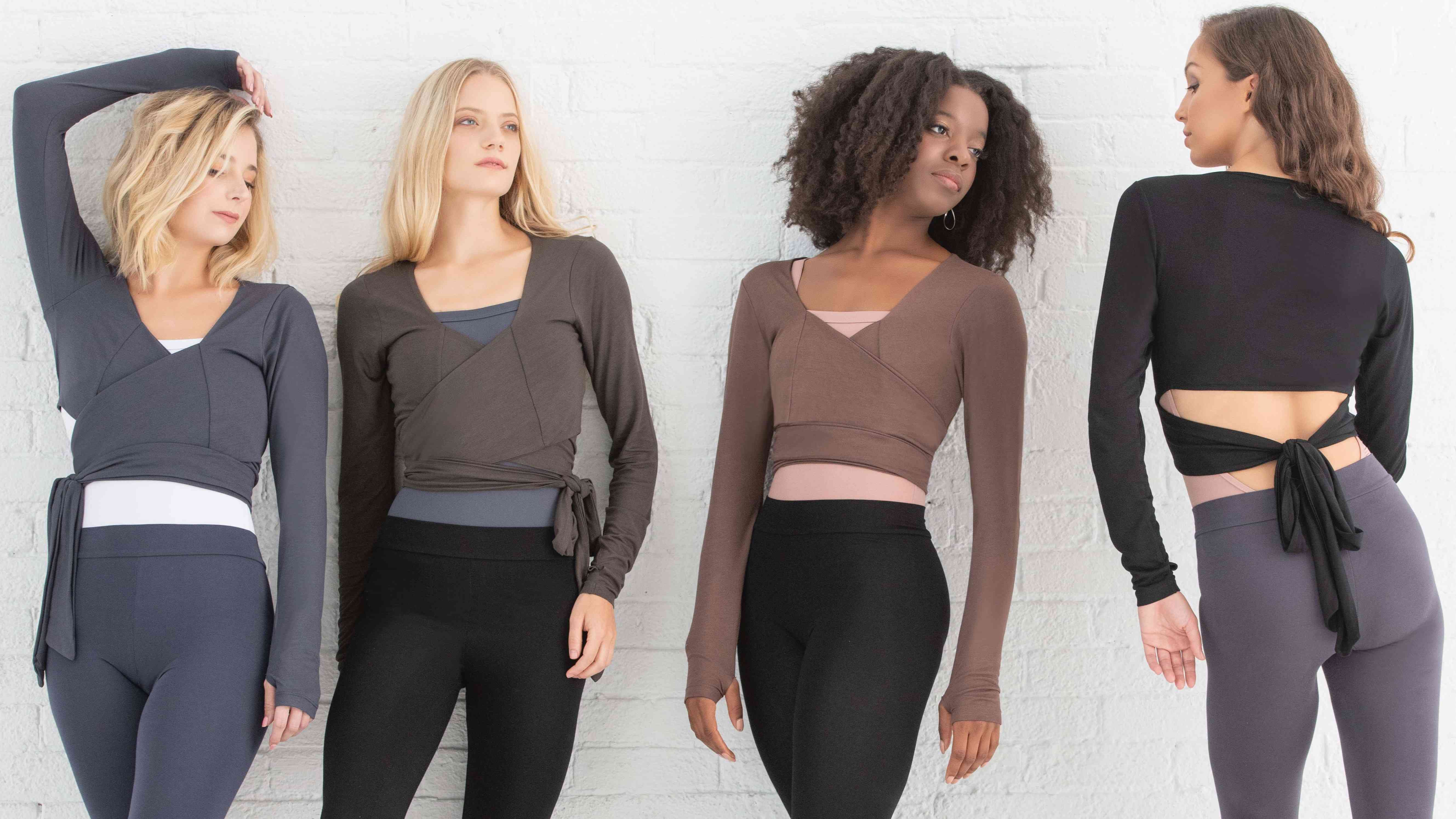 Kaori top features an elegant mock-wrap design and extra long sleeves with thumbholes.