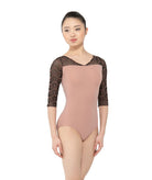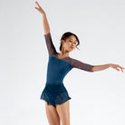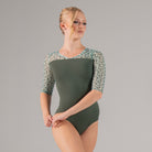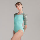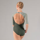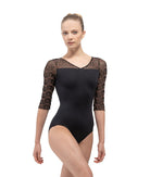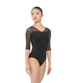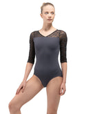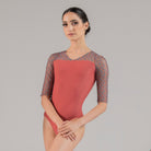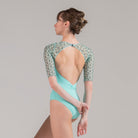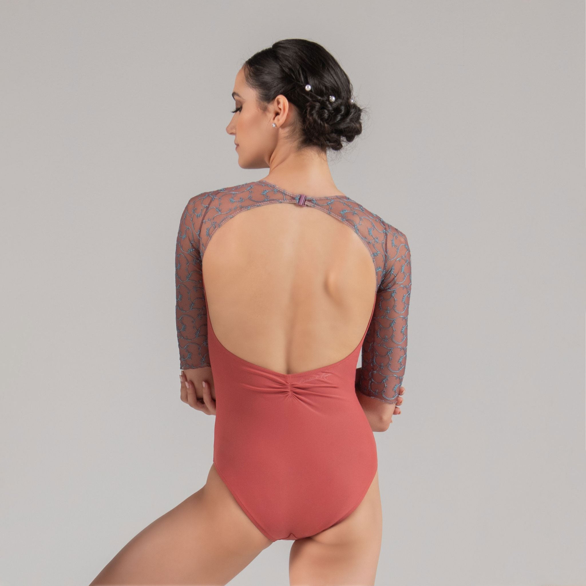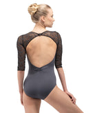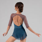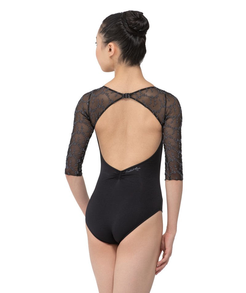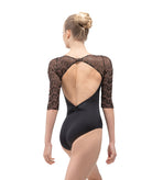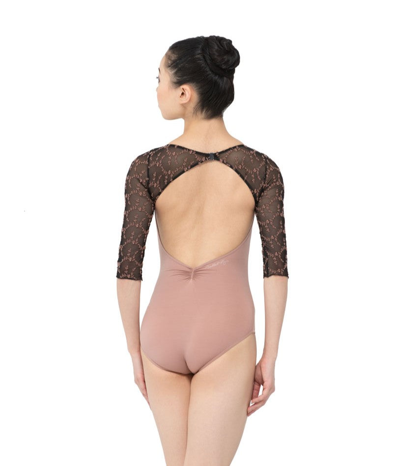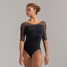 A subtle V-front leads into an open back accented with embroidered mesh, while half sleeves balance coverage and fluidity.