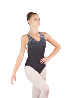 Elegantly contemporary, Tamala leotard features a modern V-neckline accented by a black and white ombré pied-de-poule print that fades to white on the back, asymmetrically framing a low scoop open back.